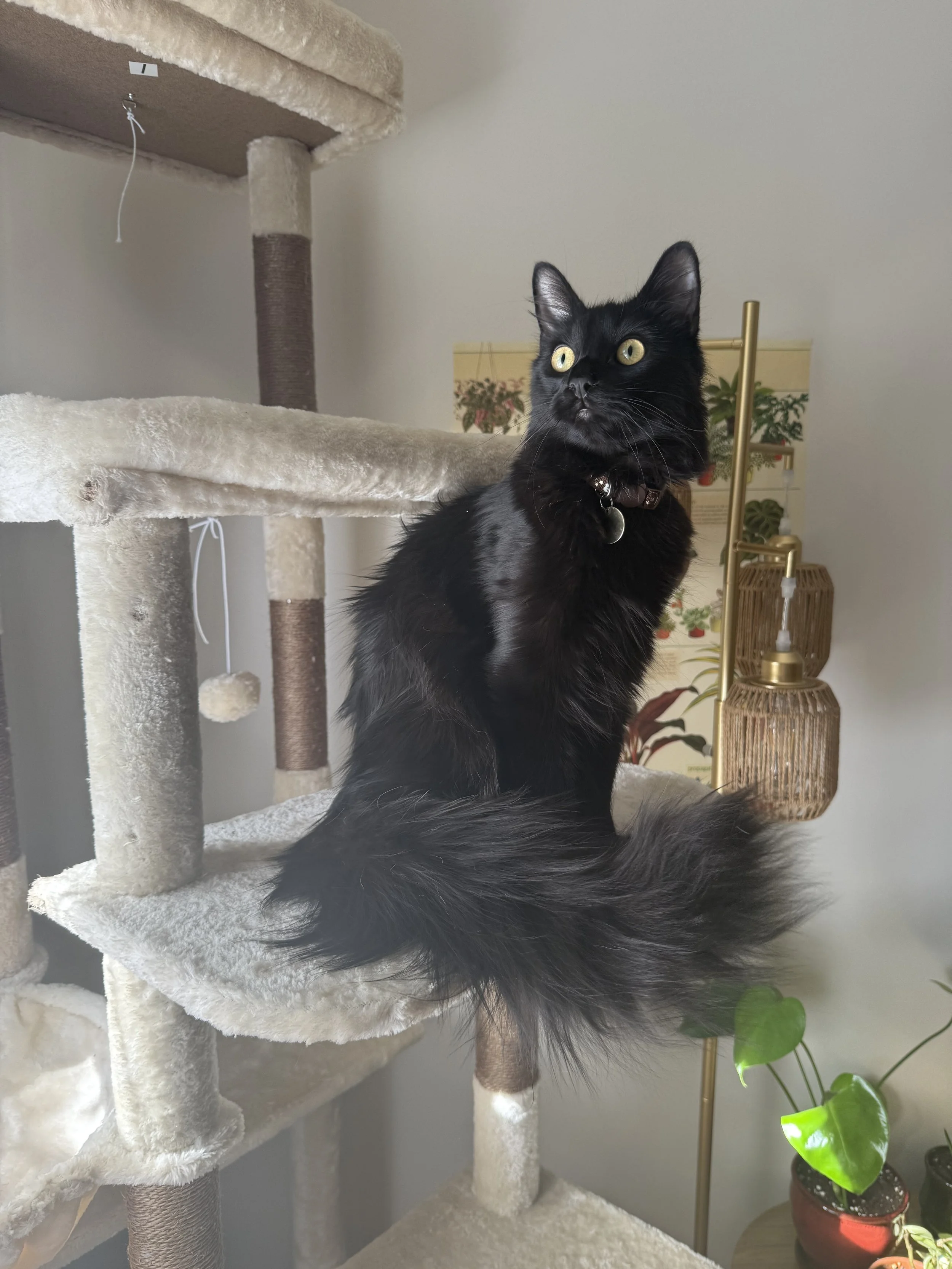 In his limited free time (he’s a busy guy!), he likes to cuddle and play with his string toys but spends most of his time with his favorite bird toy, carrying it around and dropping it in his water bowl every other hour of the day.